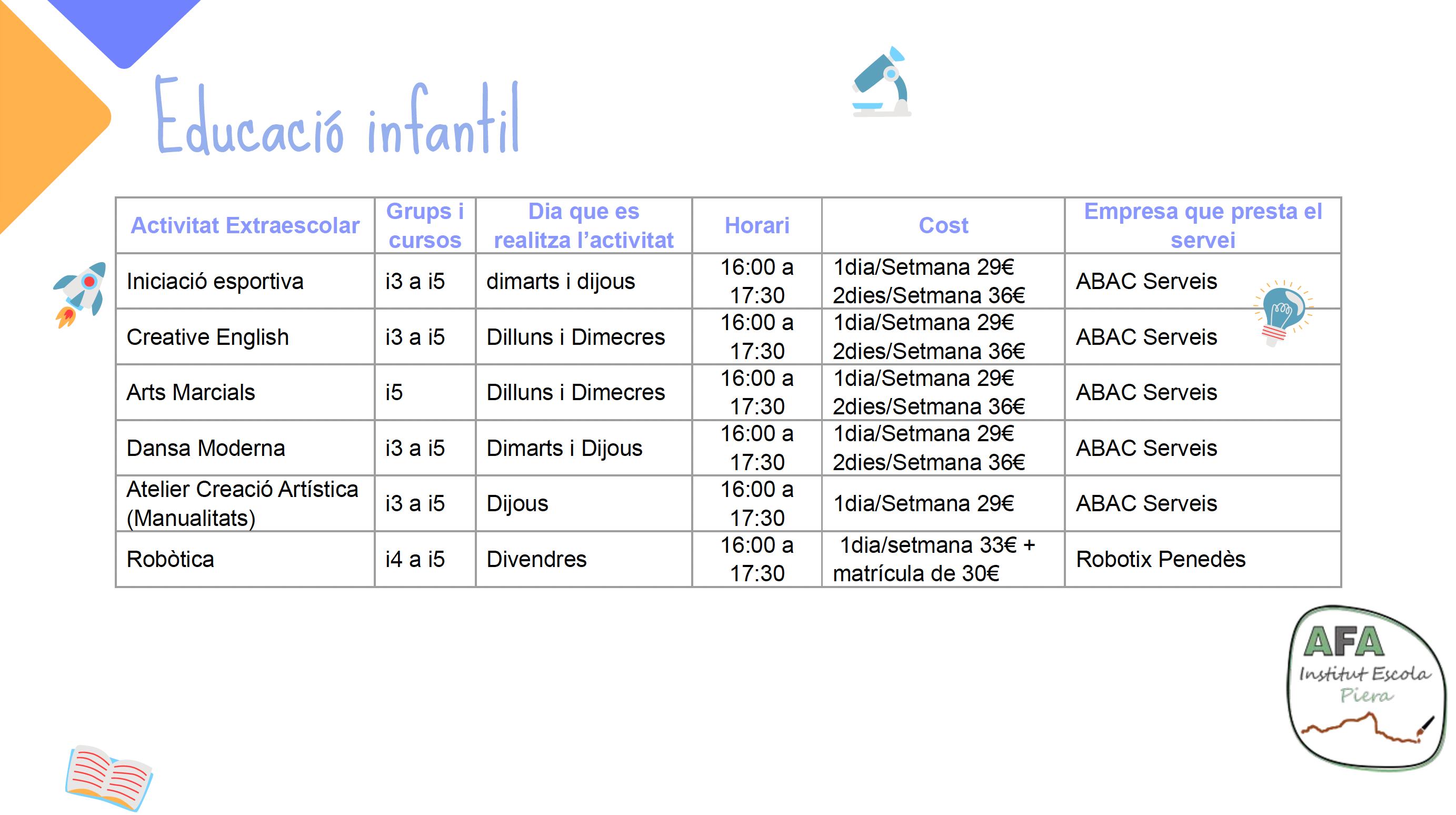 Durant aquest curs escolar 2025/2026, l’AFA, juntament amb les empreses col·laboradores, han organitzat diferents activitats extraescolars. Després d’analitzar la demanda actual, les activitats extraescolars que es realitzaran al llarg del curs seran: