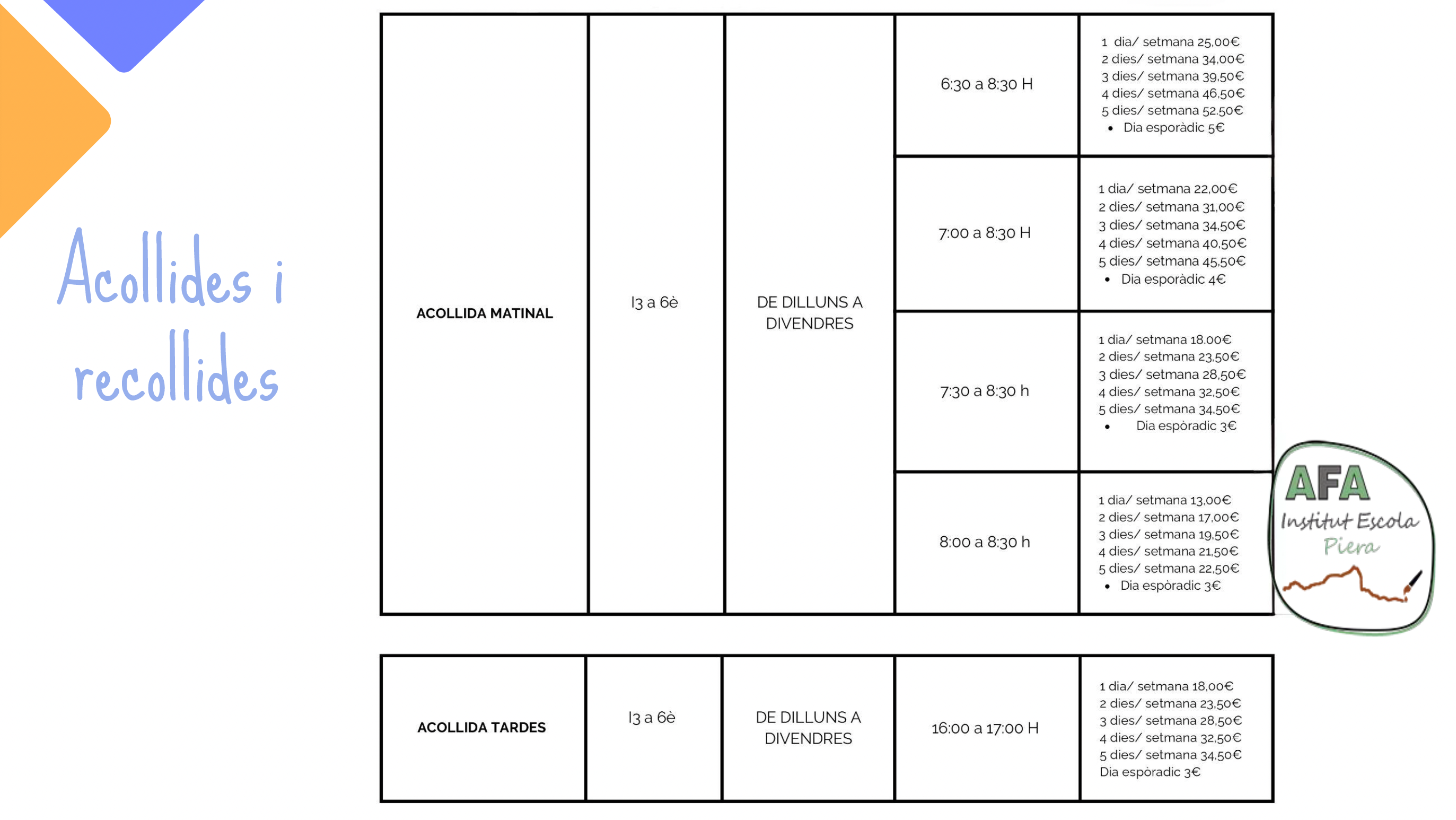 També pots consultar les diferents opcions d’acollida matinal i de tarda que s’ofereixen.
